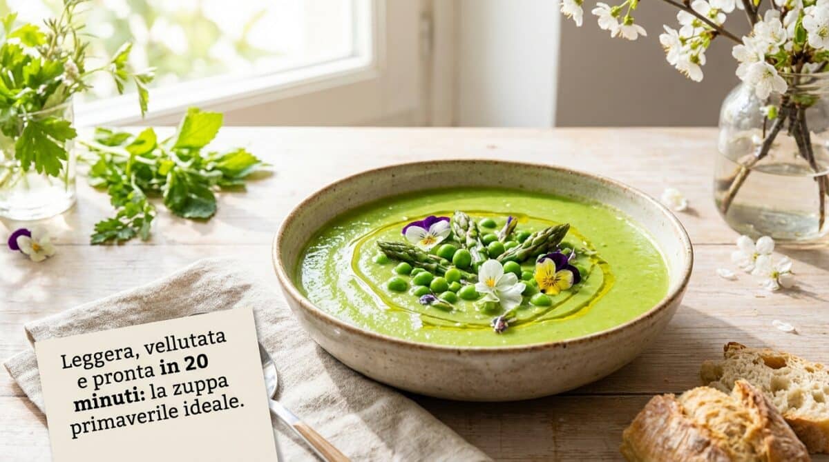 Questa zuppa primaverile è una delle mie coccole più amate quando la stagione si fa più dolce. Mi ricorda le domeniche in campagna dalla nonna, con gli odori freschi delle erbe e la leggerezza che ti fa sentire leggero ma soddisfatto. È quella ricetta che preparo quando ho poco tempo ma voglio comunque qualcosa di genuino e confortante.